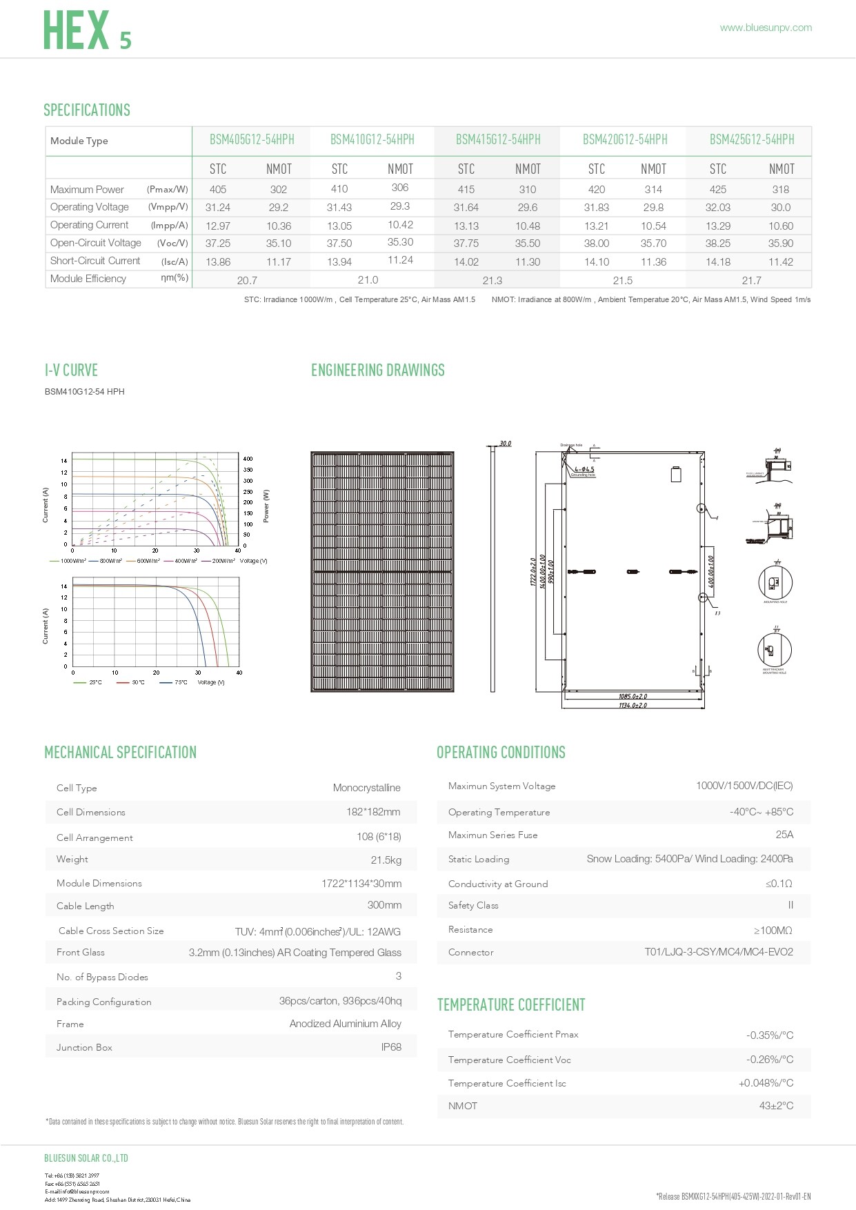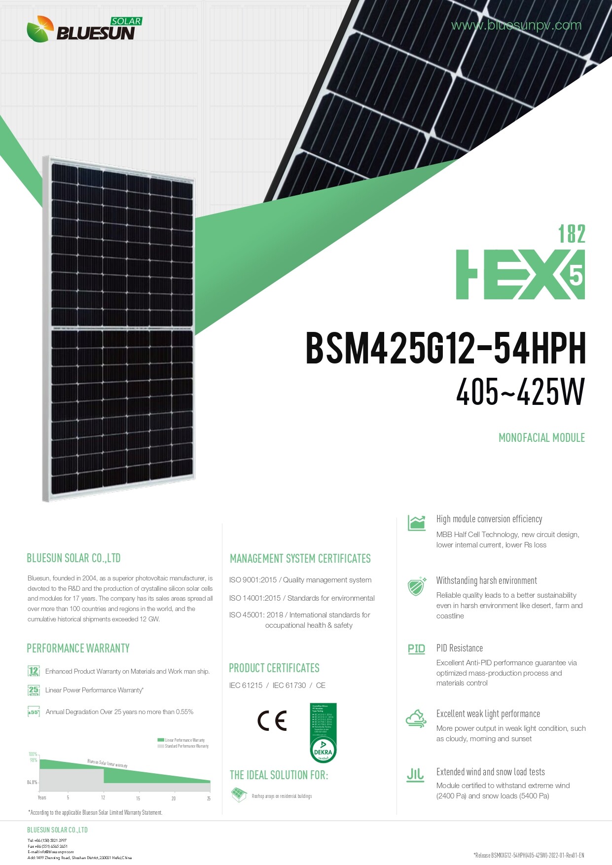 The modern technologies used and the precise soldering process allow to reduce the risk of hot spots. The panels work efficiently even on cloudy days and when they have limited access to light (e.g. in the morning). Product certificates (IEC 61215, IEC 61730) confirm resistance to strong winds (2400 Pa) and static snow loads (5400 Pa). Bluesun Solar Energy 425W modules are a great solution especially for photovoltaic installations on pitched and flat roofs!
