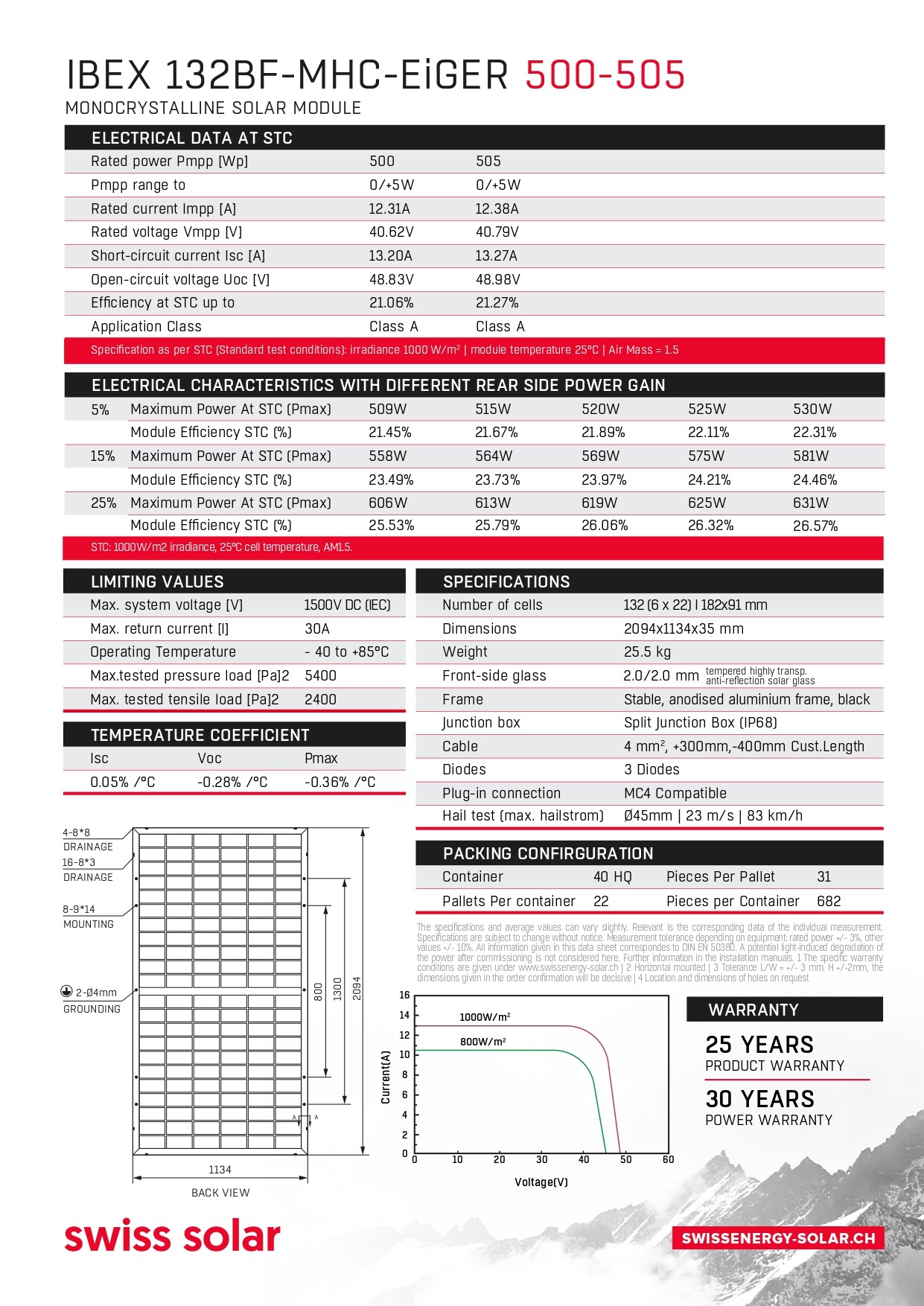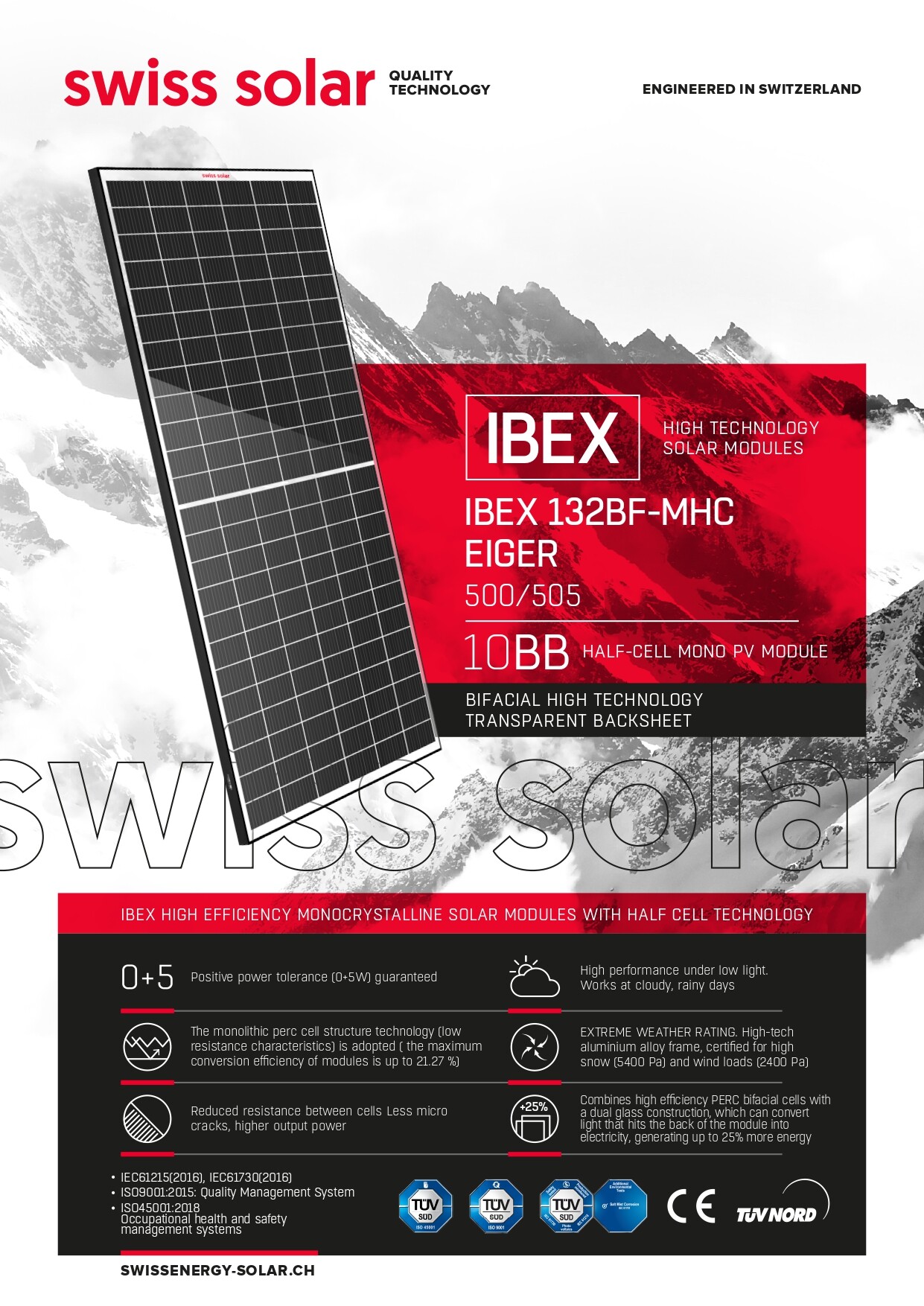 Swiss Solar photovoltaic panel with a power of 500 W, thanks to the EiGER BIFACIAL technology, the modules ensure high efficiency even on cloudy days and additional yield when used on the ground or flat roofs. Technologies such as Half Cut Perc additionally increase the efficiency of the panels.