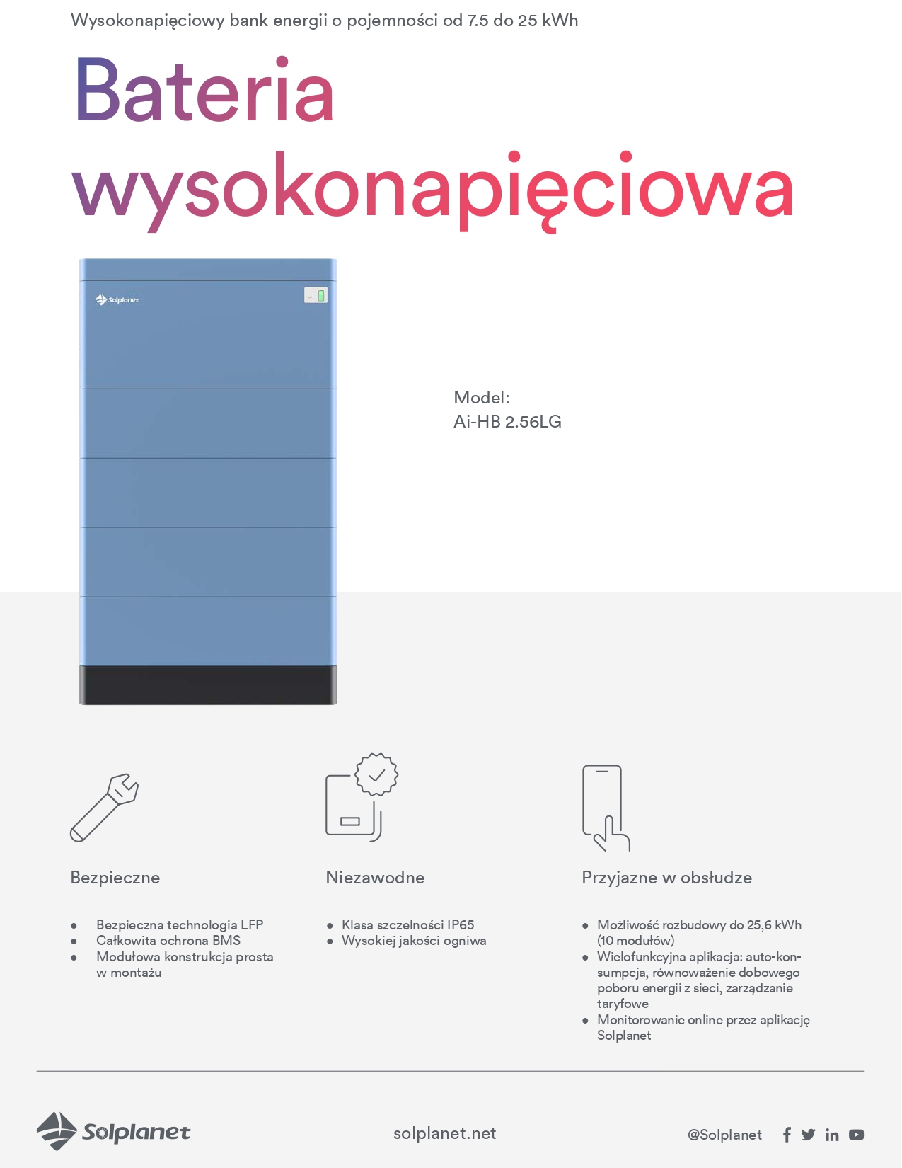 Wysokonapięciowy magazyn energii Solplanet jest niezawodny i perfekcyjny do zastosowania w duecie z inwerterami hybrydowymi. Elastyczny system pozwala na rozbudowę magazynu do aż 25,60 kW (od 3 do 10 modułów typu Plug&Play). Aplikacja mobilna daje możliwość śledzenia pracy instalacji PV oraz magazynu eneegii z każdego miejsca na ziemi!
