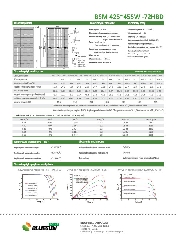 Podwójnie przeszklony panel fotowoltaiczny (technologia Bifacial) o mocy 455 W. Technologia Bifaciala zapewnia większą wydajność ogniw, a dodatkowo gwarantuje wysokie bezpieczeństwo - podwójnie przeszklone panele fotowoltaiczne są całkowicie niepalne!