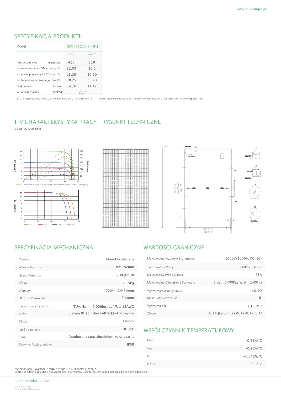 Zastosowane nowoczesne technologie oraz precyzyjny proces lutowania pozwalają zmniejszyć ryzyko pojawienia się hot spot'ów. Panele pracują wydajnie nawet podczas pochmurnych dni oraz gdy mają ograniczony dostęp do światła (np. o poranku). Certyfikaty produktu (IEC 61215, IEC 61730) potwierdzają wytrzymałość na silne wiatry (2400 Pa) oraz obciążenia statyczne śniegiem (5400 Pa). Moduły Bluesun Solar Energy 425W to świetne rozwiązanie szczególnie w przypadku instalacji fotowoltaicznych na dachach skośnych i płaskich!