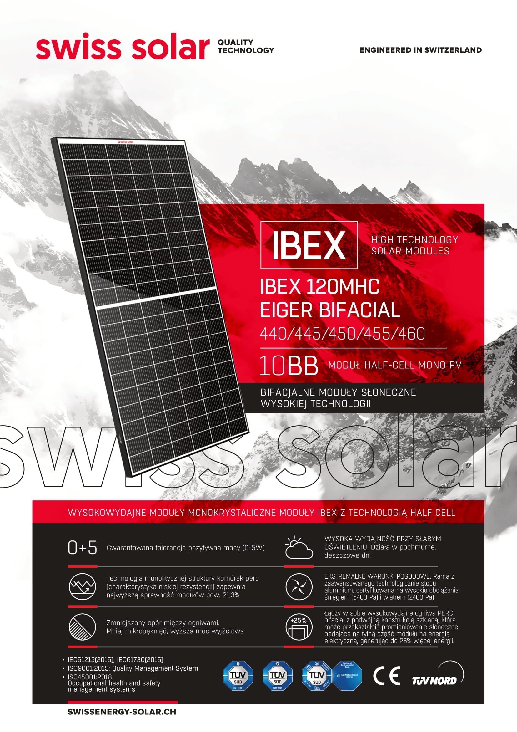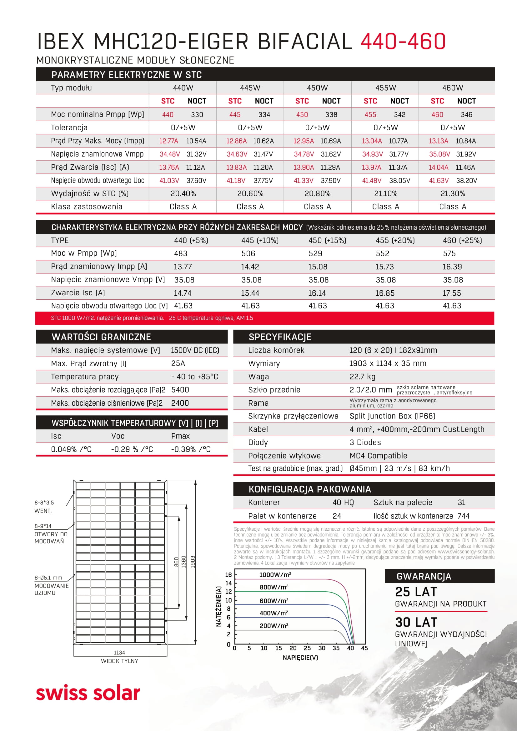 Panel fotowoltaiczny Swiss Solar o mocy 450 W, dzięki technologi EiGER moduły zapewniają wysoką wydajność nawet w pochmurne dni oraz dodatkowy uzysk w przypadku zastosowania na gruncie lub dachach płaskich (technologia Bifacial). Technologie takie jak Half Cut Perc dodatkowo zwiększają sprawność paneli.