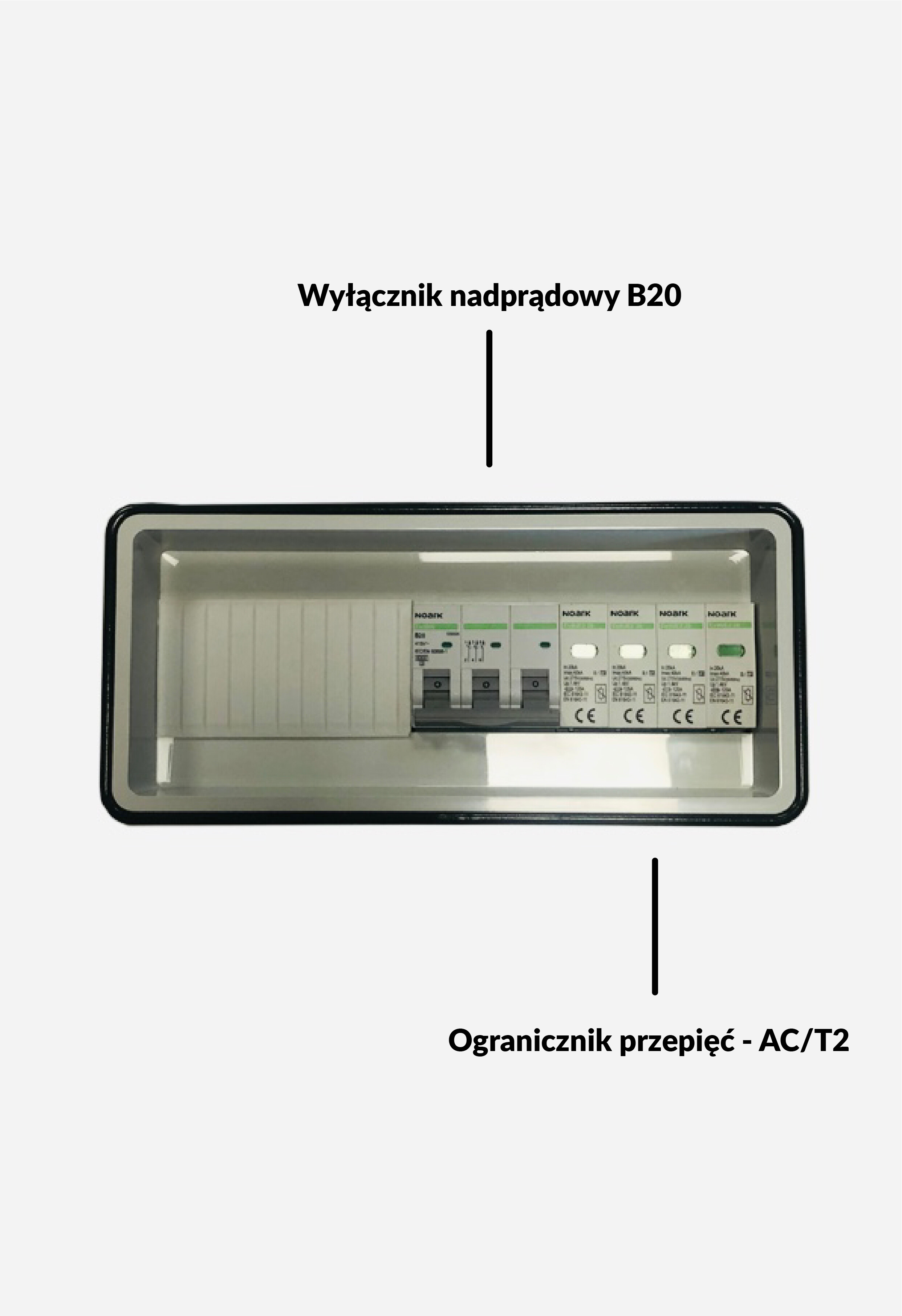 Rozdzielnica fotowoltaiczna z wyłącznikiem nadprądowym, ogranicznikiem przepięć po stronie AC typu T2. W skrzynce zastosowane przewody solarne 6mm2 (zestaw zawiera złączki MC4).